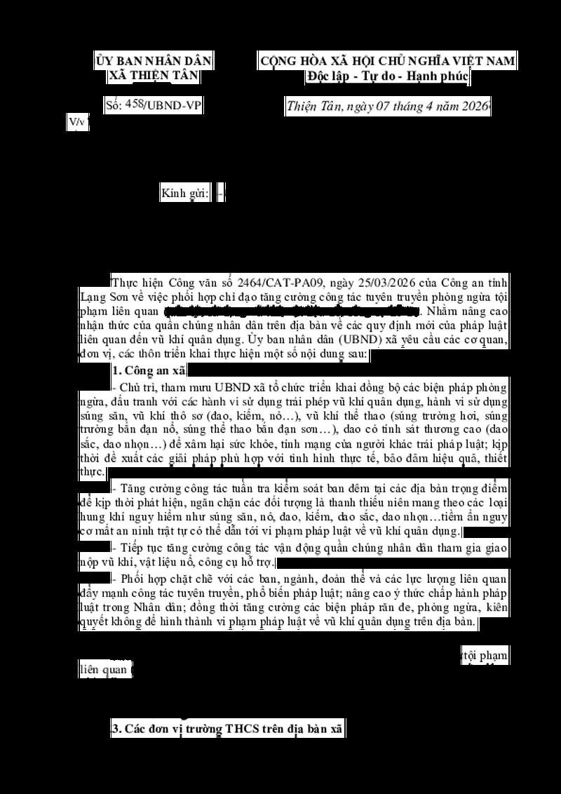 | Tiêu đề văn bản | Công văn về việc tăng cường công tác tuyên truyền, phòng ngừa tội phạm về quản lý, sử dụng vũ khí, vật liệu nổ, CCHT | ||