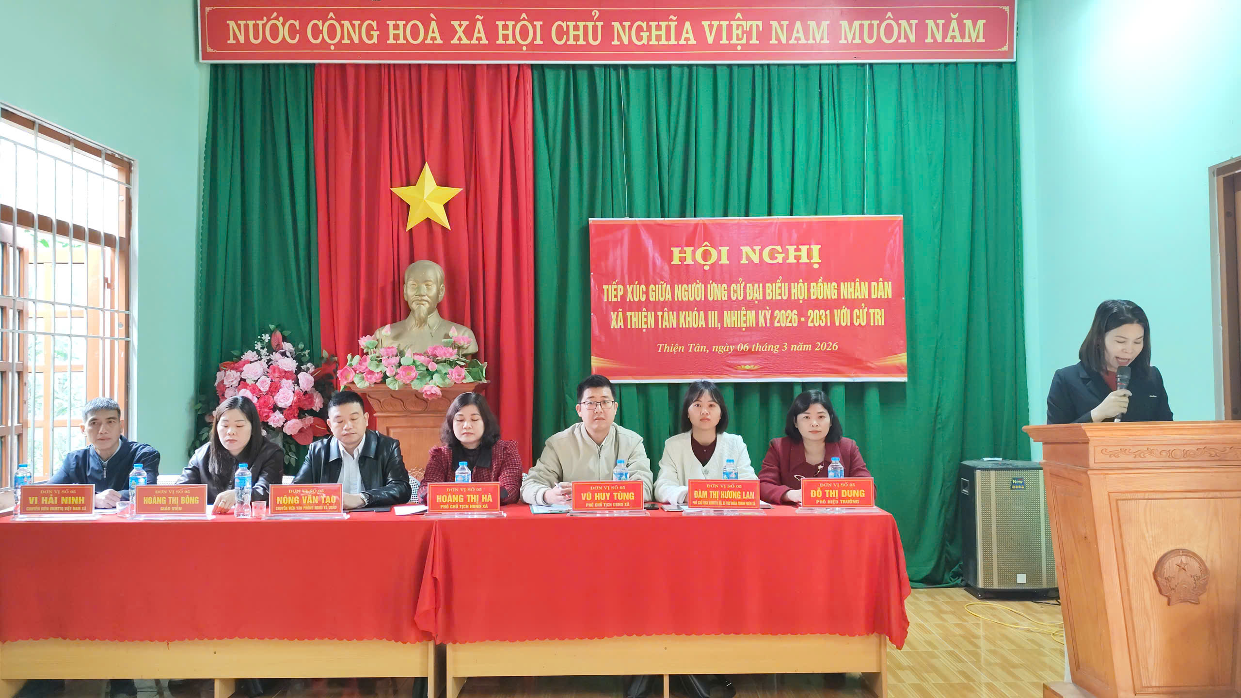 Đơn vị bầu cử số 05 có 07 ứng cử viên đại biểu HĐND xã nhiệm kỳ 2026 – 2031 gồm: ông Vũ Huy Tùng, Uỷ viên BTV Đảng uỷ, Phó Chủ tịch UBND xã; bà Hoàng Thị Hà, Đảng uỷ viên, Phó Chủ tịch HĐND xã; bà Đàm Thị Hương Lan, Phó Chủ tịch UB MTTQ Việt Nam xã, Bí thư Đoàn TNCS Hồ Chí Minh xã Thiện Tân; bà Đỗ Thị Dung, Phó hiệu trưởng Trường Mầm Non 2 thiện Tân, xã Thiện Tân; ông Nông Văn Tạo, Chuyên viên Văn phòng HĐND&UBND xã Thiện Tân; ông Vi Hải Ninh, Chuyên viên Uỷ ban Mặt trận, Tổ quốc Việt Nam xã Thiện Tân; bà Hoàng Thị Bồng, Giáo viên Trường Mầm non 2 Thiện Tân, xã Thiện Tân.