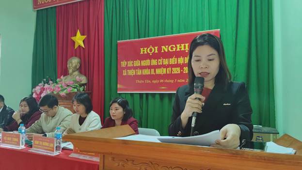 Bà Đàm Thị Hương Lan, Phó Chủ tịch UB MTTQ Việt Nam xã, Bí thư Đoàn TNCS Hồ Chí Minh xã Thiện Tân trình bày chương trình hành động tại hội nghị