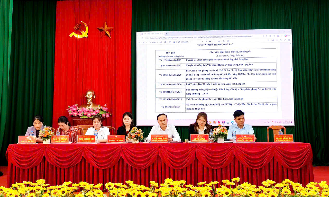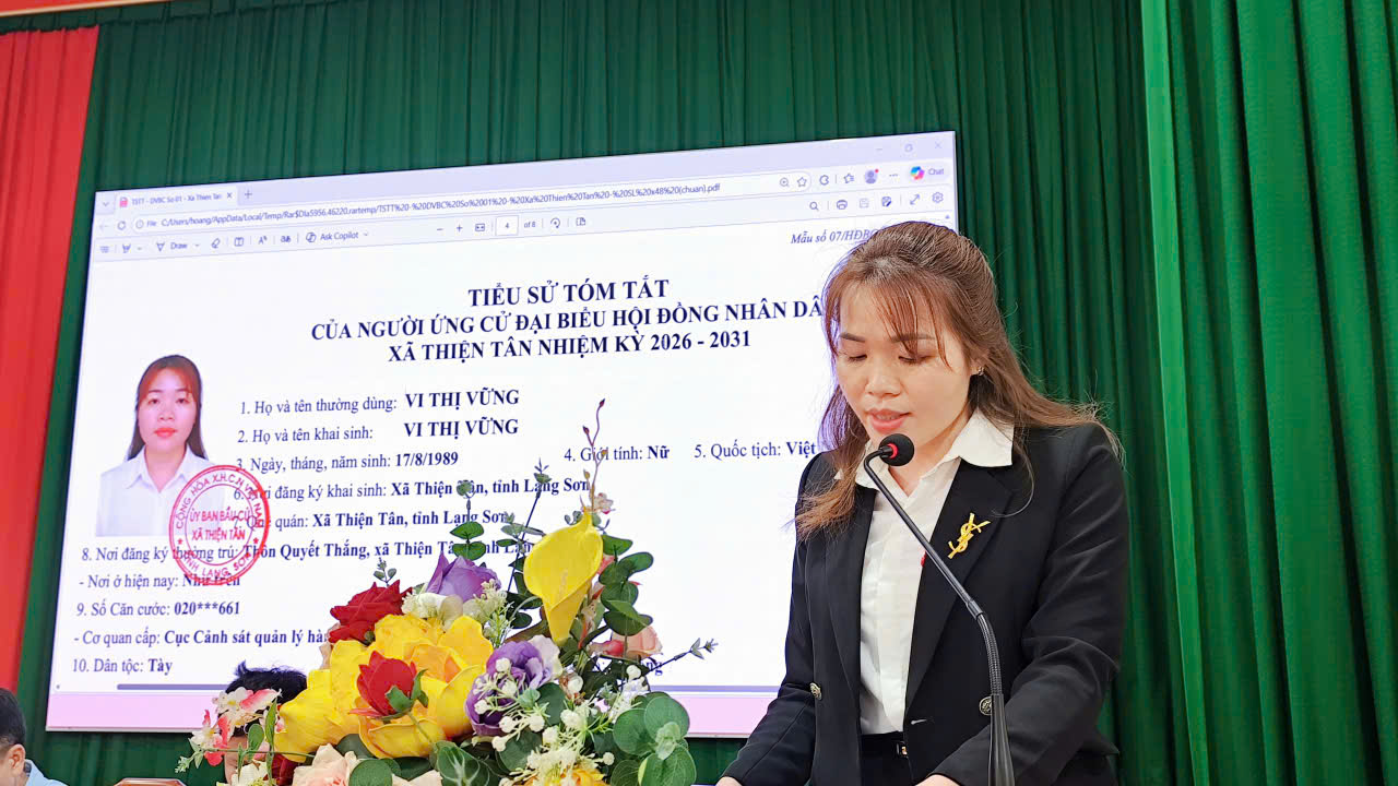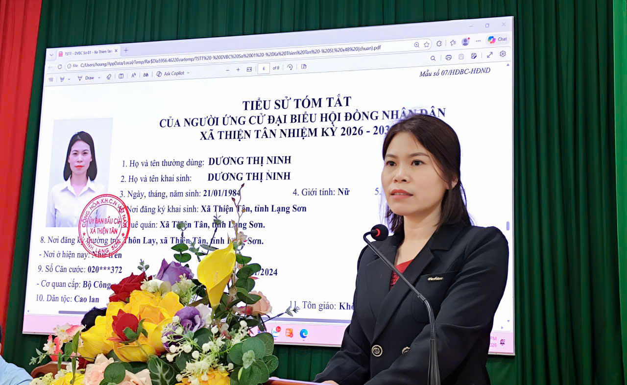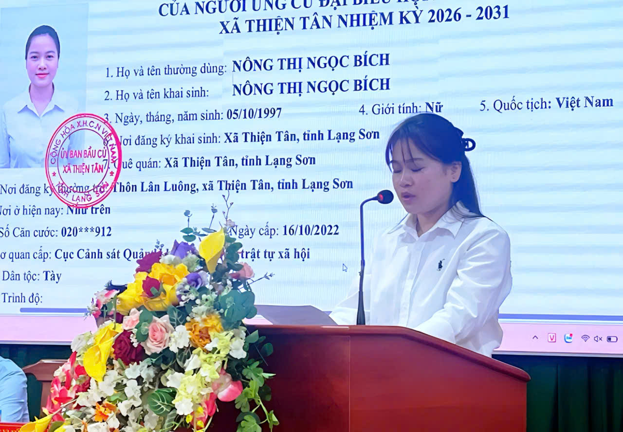 Đơn vị bầu cử số 01 có 08 ứng cử viên đại biểu HĐNX xã, khoá III, nhiệm kỳ 2026 – 2031 gồm: ông Cao Huy Hải, Uỷ viên BTV Đảng uỷ, Chủ tịch Uỷ Ban MTTQ Việt Nam, xã Thiện Tân; ông Hoàng Văn Kiều, Đảng uỷ viên, Phó Chủ tịch Thường trực UBMTTQ Việt Nam, Chủ tịch Hội nông dân xã; bà Dương Thị Ninh, Đảng uỷ viên, Phó Chủ tịch UBMTTQ Việt Nam, Chủ tịch Hội Liên hiệp Phụ nữ xã; ông Nguyễn Văn Toàn, Đảng uỷ viên, Phó Chủ tịch UBMTTQ Việt Nam, Chủ tịch Hội cựu chiến Binh xã; bà Vi Thị Vững, Chuyên viên Văn phòng HĐND&UBND xã; bà Đỗ Thị Thơm, Chuyên viên UBMTTQ Việt Nam xã; bà Nông Thị Ngọc Bích, Nông dân, thôn Lân Luông xã Thiện Tân; bà Sầm Thị Hường, Nông dân thôn Liên Phương, xã Thiện Tân.
