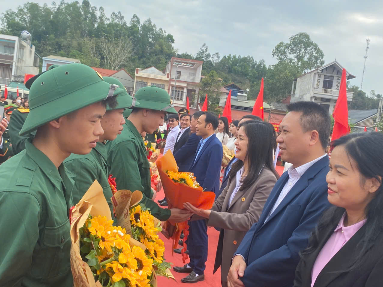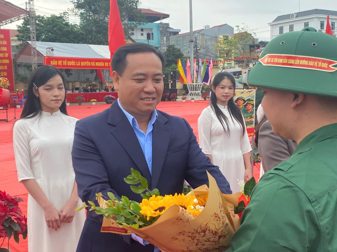 Đồng chí Lý Hoàng Long, Phó bí thư Đảng uỷ, Chủ tịch UBND xã Thiện Tân, Chủ tịch Hội đồng NVQS xã tặng hoa các chiến sỹ