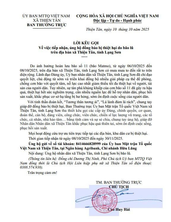 Lời kêu gọi về việc tiếp nhận, ủng hộ đồng bào bị thiệt hại do bão lũ trên địa bàn xã Thiện Tân, tỉnh Lạng Sơn