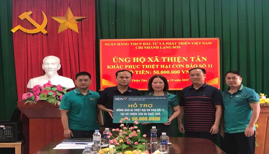 Ngày 23 tháng 10 năm 2025, tại trụ sở UBND xã Thiện Tân, Ngân hàng TMCP đầu tư và phát triển Việt Nam Chi nhánh Lạng Sơn, đã trao tặng 50 triệu đồng tiền mặt ủng hộ Nhân dân xã Thiện Tân bị ảnh hưởng bởi cơn bão số 11 vừa qua.
