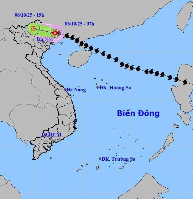Thông tin về cơn bão số 11 Sáng nay ngày 06/10/2025, sau khi đi sâu vào đất liền tỉnh Quảng Tây (Trung Quốc), bão số 11 đã suy yếu thành áp thấp nhiệt đới. Sức gió mạnh nhất vùng gần tâm áp thấp nhiệt đới cấp 7 (50–61 km/giờ), giật cấp 9. Di chuyển theo hướng Tây, tốc độ 20–25 km/giờ. 📍 Dự báo diễn biến (12 giờ tới) 19 giờ ngày 06/10: Hướng di chuyển: Tây Tây Bắc, 20–25 km/giờ Vị trí: 22,5°N – 104,8°E, trên khu vực vùng núi Bắc Bộ Cường độ: Suy yếu thành vùng áp thấp (cấp <6) Vùng nguy hiểm: Phía Bắc vĩ tuyến 20,00°N; phía Tây kinh tuyến 109,00°E ⚠️ Cấp độ rủi ro thiên tai: Cấp 3 – khu vực Bắc Vịnh Bắc Bộ, đất liền Quảng Ninh và Lạng Sơn 📍 Dự báo tác động của áp thấp nhiệt đới 🌊 Trên biển Trong sáng nay (6/10), khu vực Bắc Vịnh Bắc Bộ (bao gồm Bạch Long Vĩ) có gió mạnh cấp 6, giật cấp 8, sóng biển cao 2,0–3,0 m, biển động (nguy hiểm đối với tàu thuyền). 🌪️ Trên đất liền Trong sáng nay (6/10), khu vực Quảng Ninh và Lạng Sơn có gió mạnh cấp 5, có nơi cấp 6, giật cấp 7–8. 🌧️ Mưa lớn Từ sáng 6/10 đến hết đêm 7/10, khu vực vùng núi, trung du Bắc Bộ có mưa to và dông, lượng mưa phổ biến 100–200 mm, có nơi trên 300 mm. Đồng bằng Bắc Bộ, Thanh Hóa có mưa vừa – mưa to, lượng mưa phổ biến 50–150 mm, có nơi trên 200 mm. Khu vực Hà Nội: đề phòng dông, lốc và gió giật mạnh. Dự báo từ sáng 6/10 đến hết ngày 7/10 có mưa vừa – mưa to và dông (50–100 mm, có nơi trên 150 mm). Trong mưa dông có khả năng xảy ra lốc, sét và gió giật mạnh.