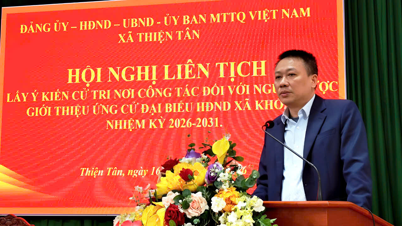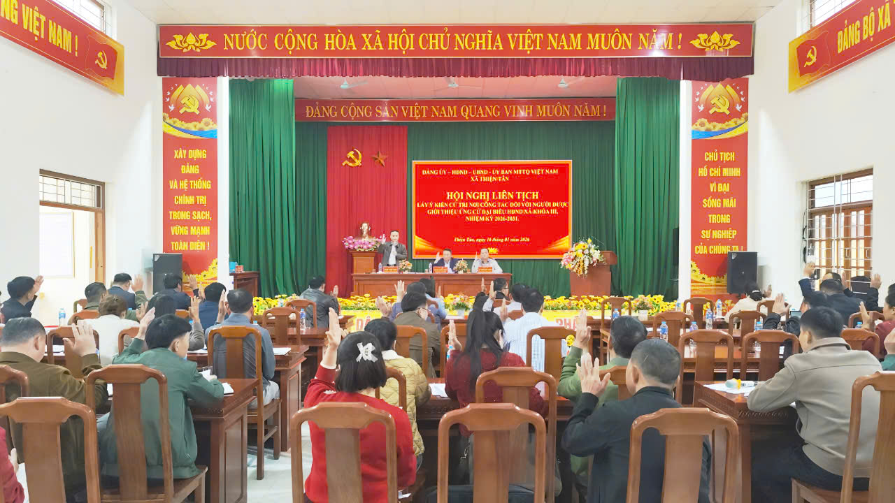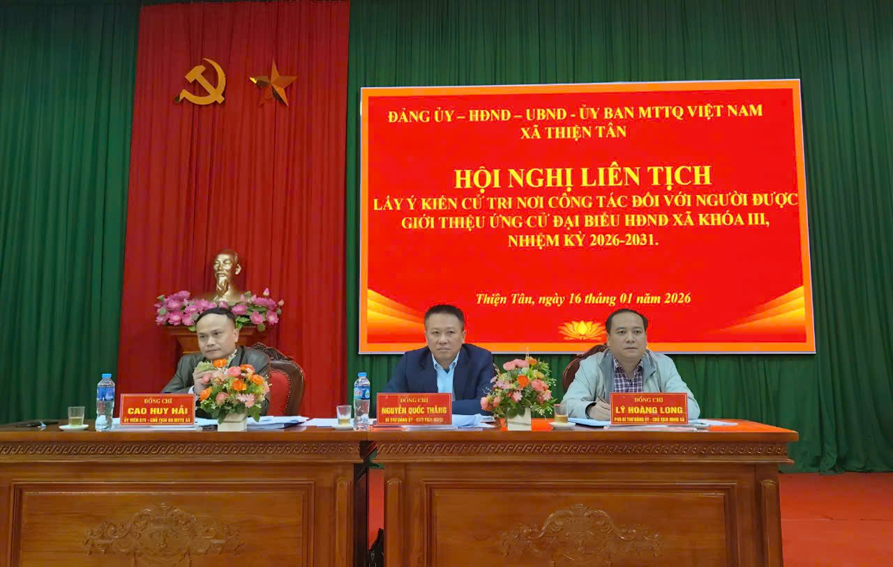 Sáng ngày 16/01/2026, Đảng ủy - HĐND - UBND - Ủy ban MTTQ Việt Nam xã Thiện Tân đã tổ chức Hội nghị lấy ý kiến cử tri nơi công tác đối với người được giới thiệu ứng cử đại biểu Hội đồng nhân dân xã Thiện Tân Nhiệm kỳ 2026–2031. Đồng chí Nguyễn Quốc Thắng, Bí thư Đảng uỷ, Chủ tịch HĐND xã; đồng chí Lý Hoàng Long, Phó bí thư Đảng uỷ, Chủ tịch UBND xã; đồng chí Cao Huy Hải, Uỷ viên BTV, Chủ tịch Uỷ ban MTTQ xã đồng chủ trì hội nghị.